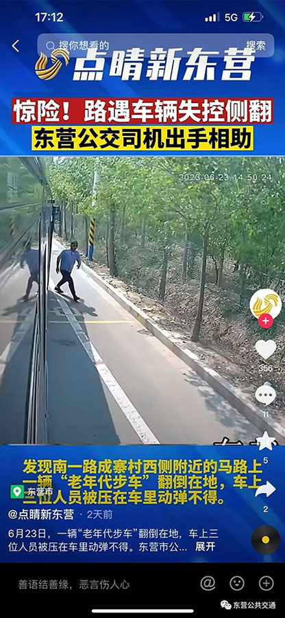 6月23日下午兩點(diǎn)五十分,孫建強(qiáng)臨時(shí)執(zhí)行26路運(yùn)行任務(wù)時(shí),看到一輛“老年代步車”側(cè)翻在地,他立馬停下公交車撥打了120電話,并對(duì)車內(nèi)的三名被困人員進(jìn)行緊急施救。在醫(yī)護(hù)人員到來前,他又從公交車上拿了些衛(wèi)生紙和礦泉水,幫傷者清理了傷口。直到目送著傷者被120送往醫(yī)院,孫建強(qiáng)懸著的心終于放下。