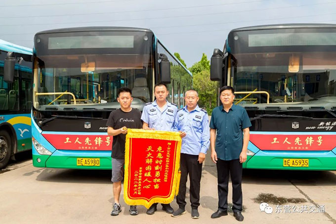 6月28日,東營安潔家具服務公司的李先生將一面印有“危急時刻勇擔當  滅火解困暖人心”的錦旗送到市公交公司汽車七隊駕駛員郭少春與劉立峰手中。原來,在6月21日,下午16:25分左右,市公交公司8路駕駛員郭少春駕駛魯EA5603公交車,由西向東行駛至海通路與濟南路路口等待信號燈時,發現右側一輛貨車從尾部竄出濃煙,隨即鳴笛警示,并將車輛行駛至輔路安全地點停靠,隨即拿起隨車攜帶滅火器趕赴貨車,對起火部位進行施救,在施救過程中,對向行駛而來的8路魯EA5980駕駛員劉立峰,也發現險情,隨即攜帶滅火器趕赴失火貨車,加入滅火戰斗。最終火勢得到了有效控制,在消防隊員趕到時明火基本已被撲滅,貨車損失不嚴重。