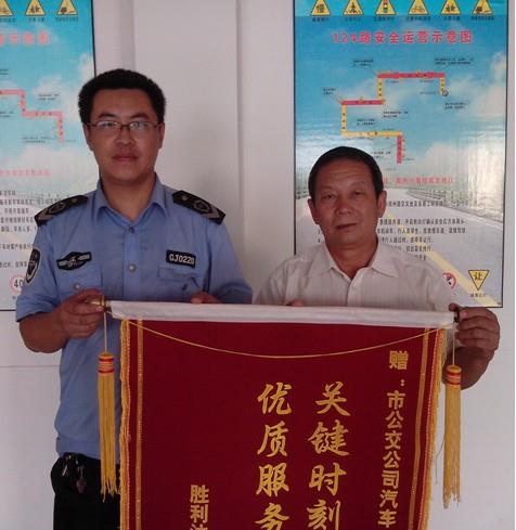 2012年8月16日,勝利油田長龍橡塑有限責任公司辦公室田主任拿著一面寫有“關鍵時刻見真情 優質服務品德高”的錦旗來到市公交公司汽車一隊,感謝車隊寧學峰師傅的高尚品德。