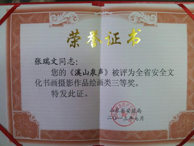 近日,剛剛揭曉的東營市安全文化書畫攝影作品有獎?wù)骷顒又校泄还緩V告部張瑞文的繪畫作品《溪山泉聲》以其豐富的表現(xiàn)力和感染力,獲得三等獎,此作品同時參加山東省安全文化書畫攝影有獎評比活動,亦獲得三等獎。
