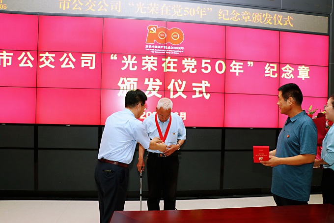 6月24日上午,在中國共產(chǎn)黨成立100周年即將到來之際,東營公交組織開展了“光榮在黨50年”紀(jì)念章頒發(fā)儀式。公司黨委書記趙龍、經(jīng)理劉海、副經(jīng)理孫紅光、景洪培和黨齡50周年老黨員以及黨員代表等參加了頒發(fā)活動。