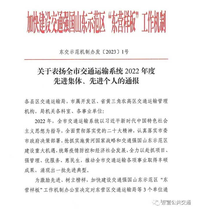 會上,加快建設(shè)交通強(qiáng)國山東示范區(qū)“東營樣板”工作機(jī)制辦公室印發(fā)了2022年度全市交通運(yùn)輸工作交通先鋒先進(jìn)集體及先進(jìn)個人表彰決定。市公交公司、市公交公司辦公室、市公交公司保修二廠獲得交通先鋒先進(jìn)集體榮譽(yù)稱號,2名同志獲得交通先鋒先進(jìn)個人榮譽(yù)稱號。