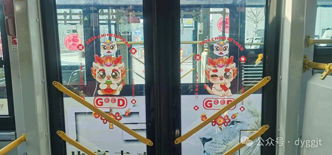 近日,為營造更加濃厚的龍年新春氛圍,給市民更好的乘車體驗,東營市公交集團在部分公交車車廂掛上了一連串的龍年拉花,還貼上了喜慶的窗花、“龍”形狀的貼畫……打造“溫馨車廂”,讓乘客一進車廂,就感受到濃厚的春節氛圍。