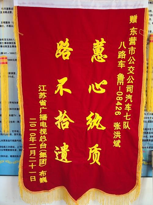 原來,2月20日,初次來東營走親訪友的失主布巍小酌后準備返程,不小心將手提包丟在8路車上,內有DV機、出國護照和工作證等物件,年后就準備出國的他非常著急。經過查詢與汽車七隊取得聯系,當得知好心駕駛員張洪斌已將失物及時上交車隊,失主布巍非常感動,因急于趕回單位出國,沒能當面致謝,特寄來錦旗表示謝意。