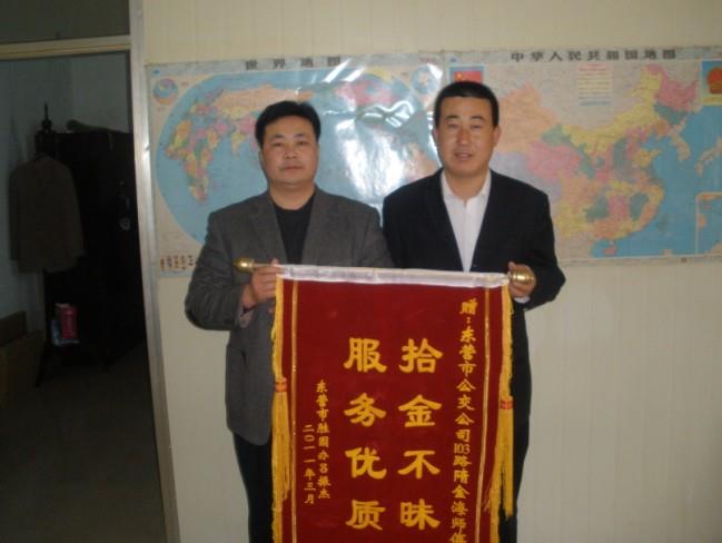2011年3月14日下午,東營市勝園辦事處的呂振杰手持“拾金不昧,服務優質”的錦旗來到市公交公司汽車一隊。