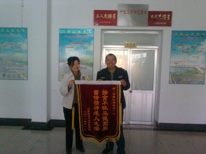 11月12日早上,山東天園銅業(yè)有限公司的耿愛華女士拿著一面寫有“拾金不昧品德高尚、雷鋒精神感人之深”的錦旗來到市公交公司汽車一隊,感謝車隊駕駛員王波師傅拾金不昧的高尚品德。據(jù)車隊了解得知,11月8日,耿愛華女士乘坐王波師傅駕駛的值班車上班。上班后發(fā)現(xiàn)裝有3000多元現(xiàn)金和手機(jī)的錢包不見了,她心急如焚,當(dāng)時就癱坐在地上。正在這時,耿愛華女士的一位同事前來告訴她丟失的錢包找到了,公交公司汽車一隊駕駛員王波師傅剛打來電話,錢包內(nèi)的3000多元現(xiàn)金和手機(jī)都在,讓她放心。原來,王波師傅執(zhí)行完任務(wù)回公司打掃車內(nèi)衛(wèi)生時,發(fā)現(xiàn)座位夾縫中有一個錢包,打開一看里面那么多現(xiàn)金,心想失主一定很著急,便通過錢包內(nèi)手機(jī)記錄的電話聯(lián)系到耿愛華女士的一位同事,讓她通知耿愛華女士及時到市公交公司汽車一隊領(lǐng)取。