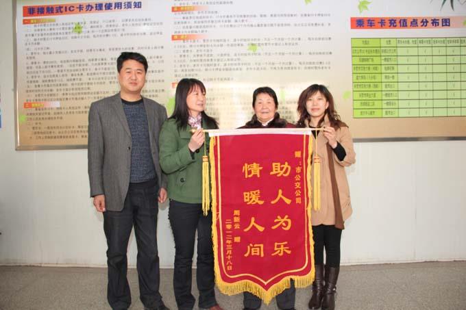 3月20日早上8:30分,一位年邁花甲的周阿姨在家人的陪伴下來到市公交公司信息中心IC卡業(yè)務(wù)辦理處,送來一面“情暖人間,助人為樂”的錦旗,以此來感謝市公交公司IC卡業(yè)務(wù)辦理處職工耿瑞華及王海紅尊老愛幼、助人為樂的優(yōu)良品質(zhì)。